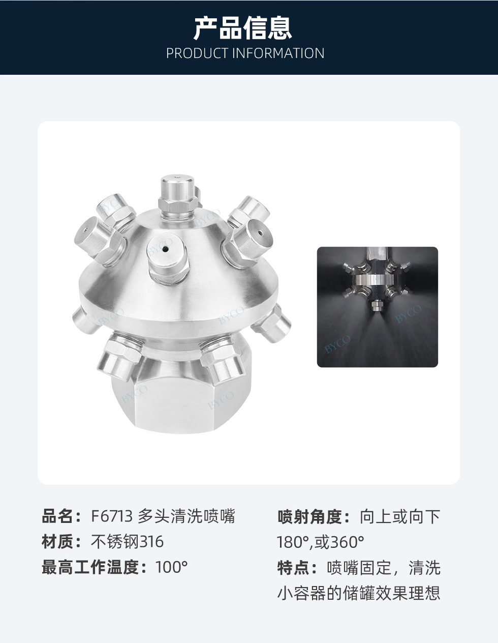 特點:固定式,用戶直徑達1.6米的槽罐,噴嘴固定,清洗或漂洗小容器的效果理想,多孔噴射,噴射的覆蓋面和形狀有多種選擇。